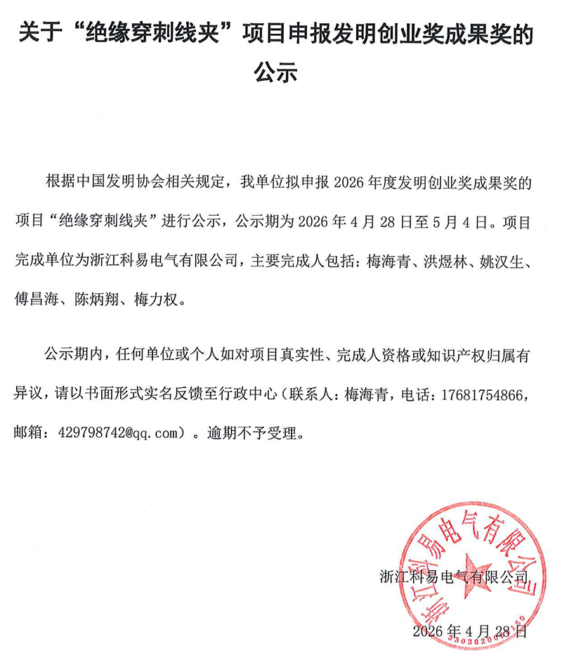 关于“绝缘穿刺线夹”项目申报发明创业奖成果奖的公示